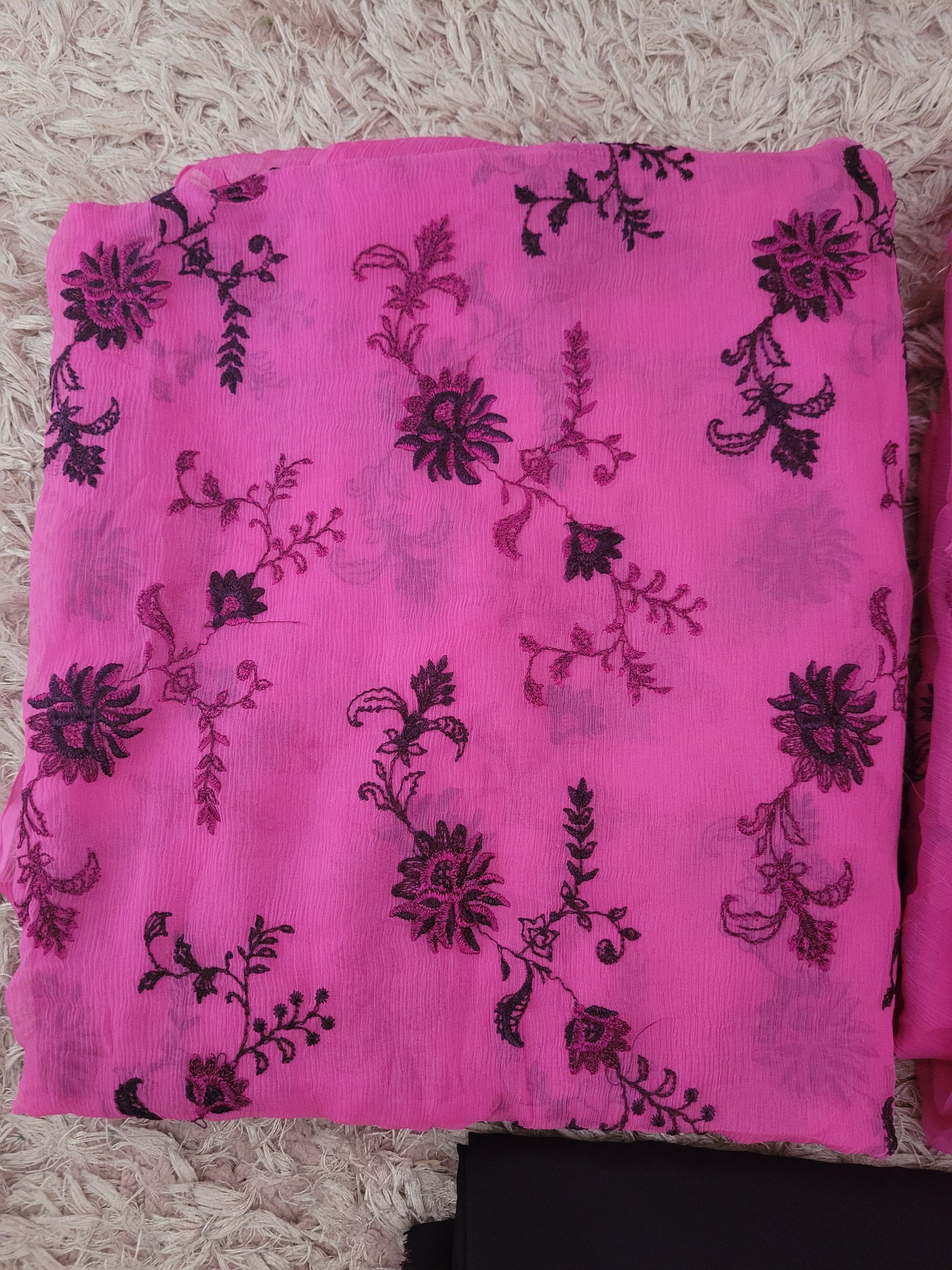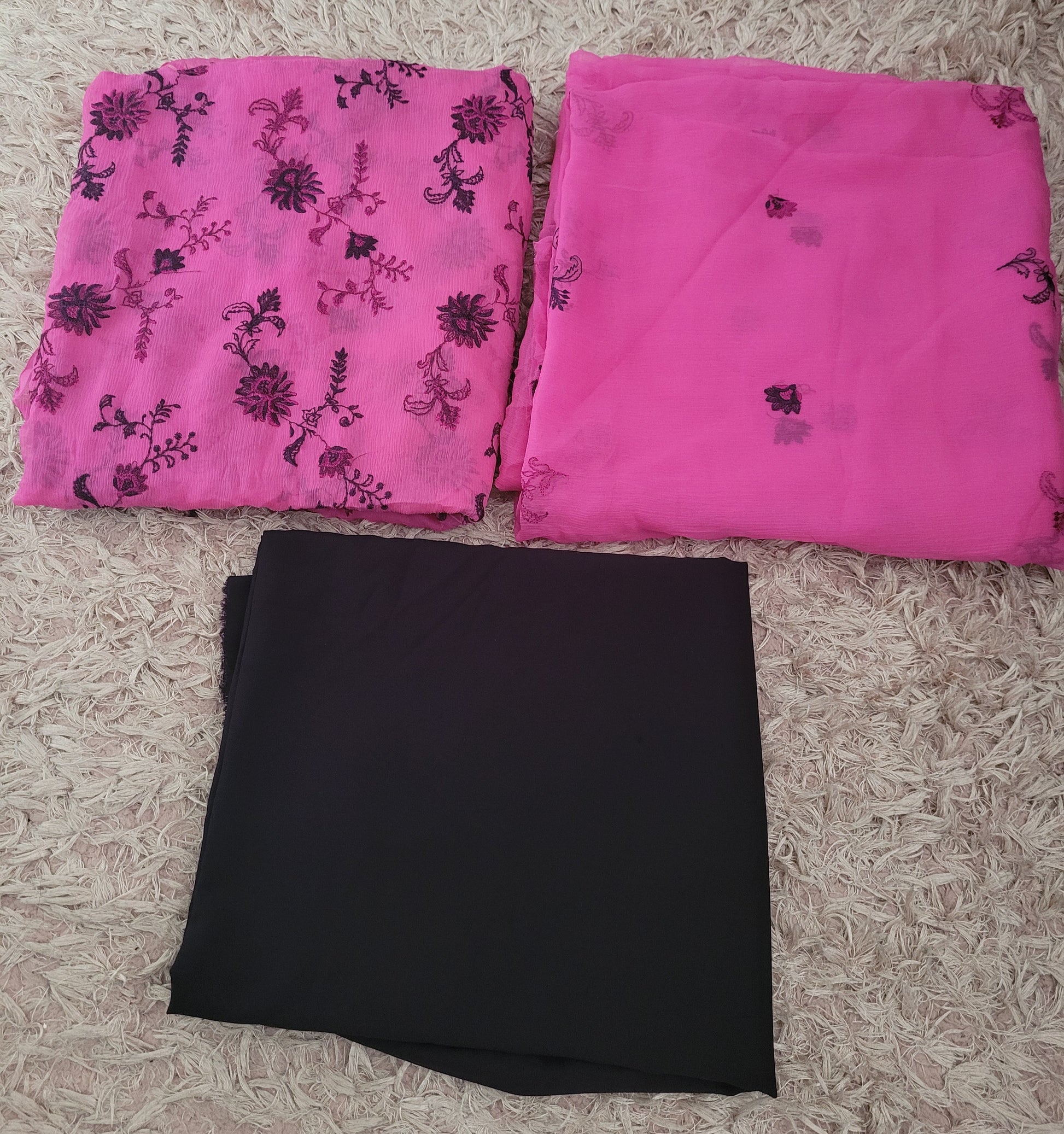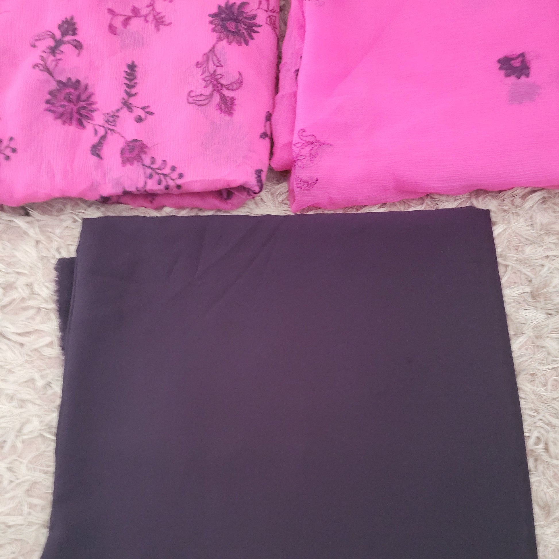 This Asian Pakistani Indian 3 piece unstitched chiffon suit in pink and purple traditional style is perfect for women who want to represent their culture with elegance. The set includes a salwar kameez, showcasing intricate embroidery and designs typical of Pakistani and Indian attire. The chiffon material adds a luxurious touch, making it a popular choice for special occasions or traditional events. Perfect for those looking to make a statement with their outfit while staying true to their heritage.