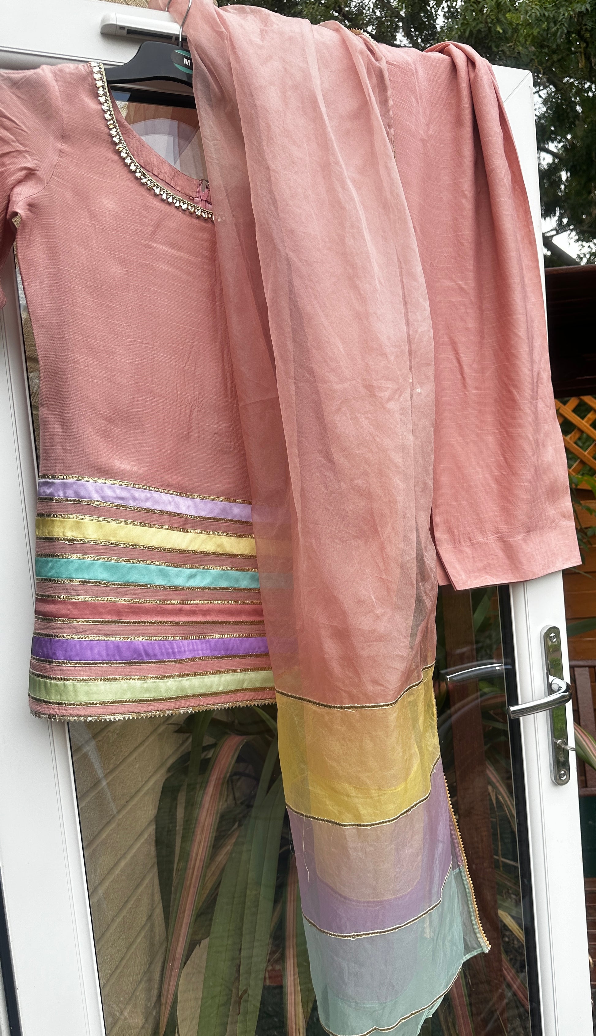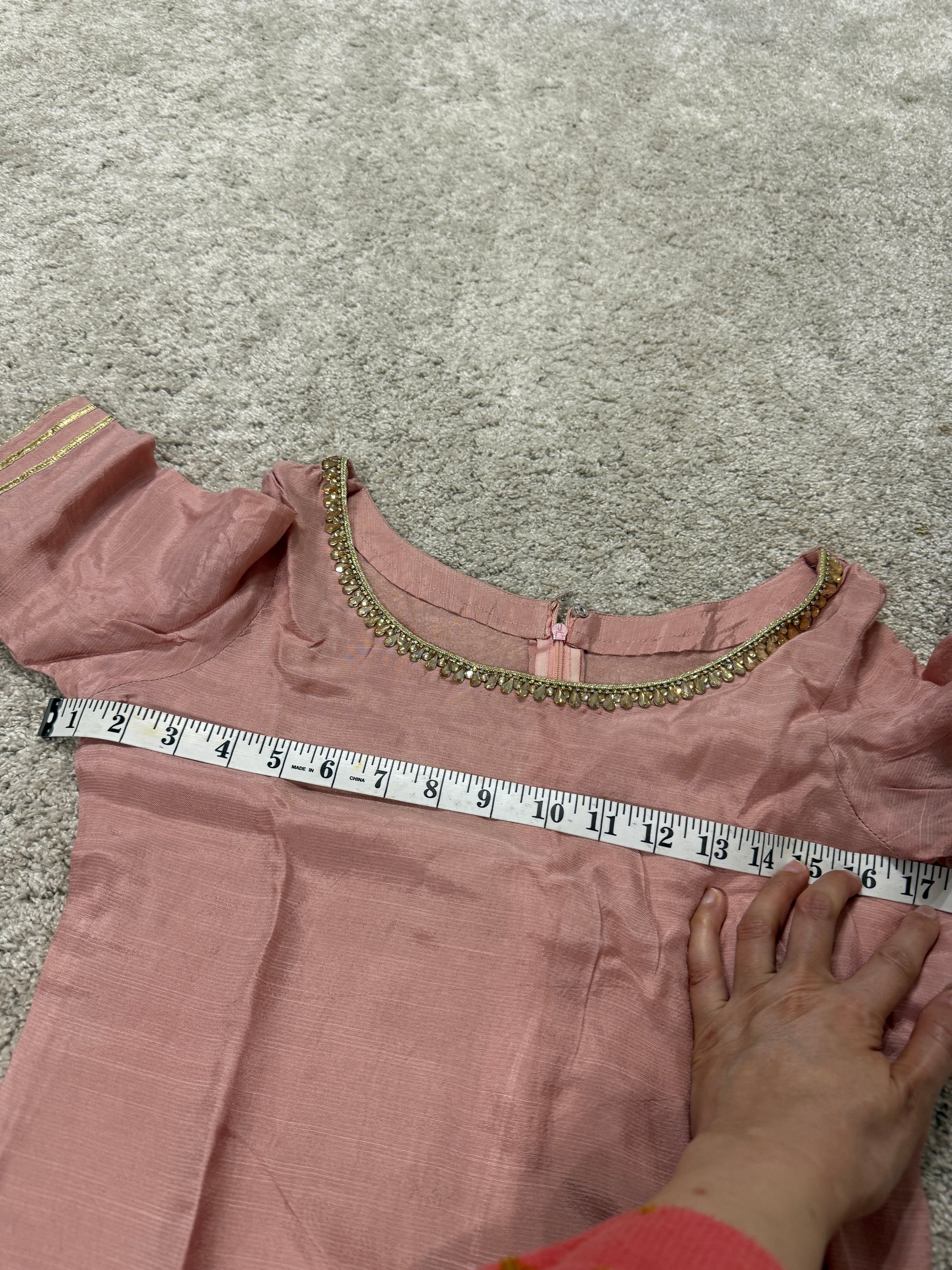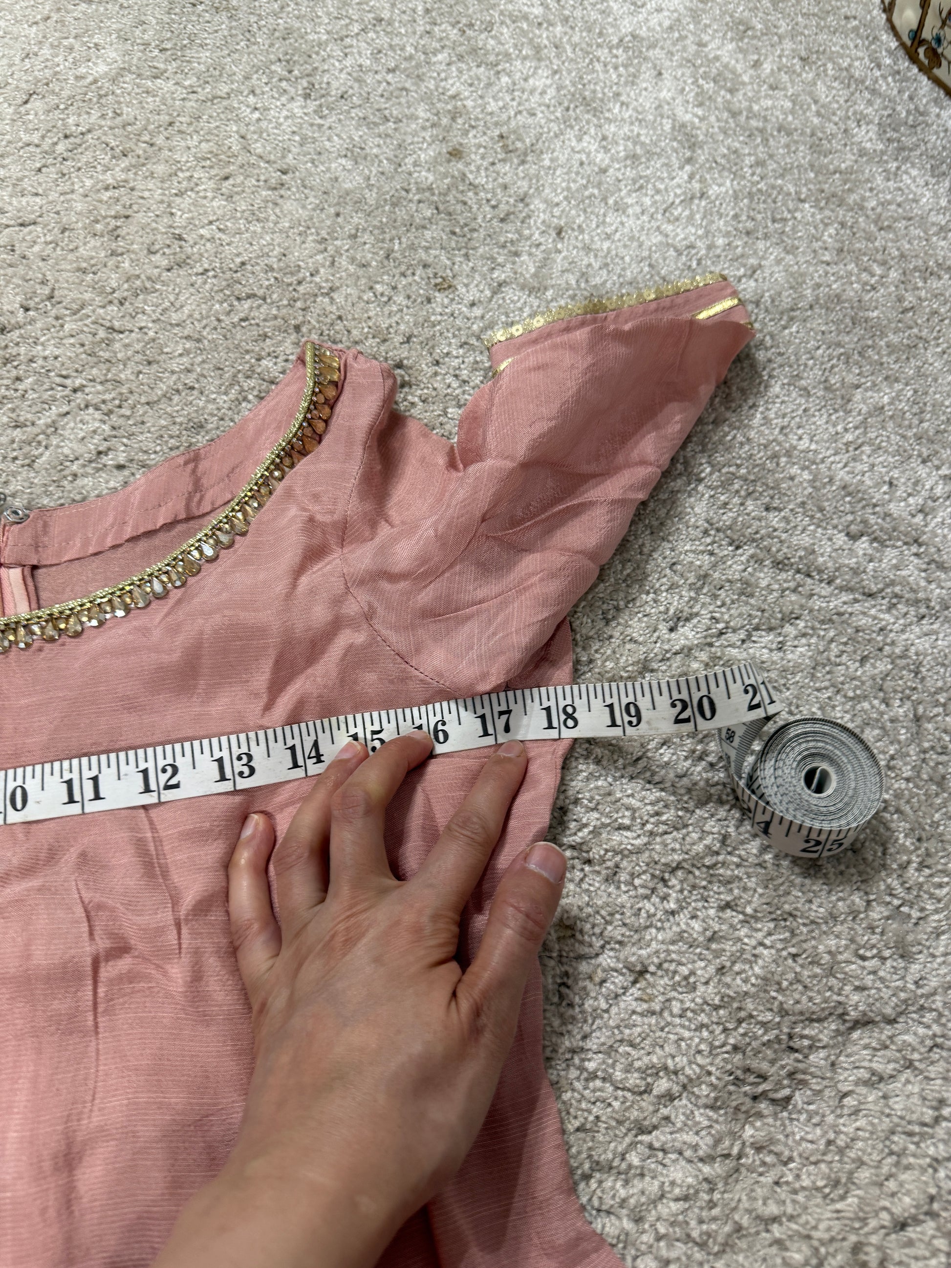 Pure 60 gram threads and motifs raw silk. Beautiful tea pink colour. Zehra saleem inspired dress stitched beautifully with lots of detailing. Very trendy. Measurements are; chest 18 inch, shoulder 14, waist with zip 15, length 29, hip, 19, shalwar 39. Sleeves 12 Short shirt with ghera dar shalwar, organza chata Patti dupatta 3 yards. It's very stylish and outstanding piece. Worn only for couple of hours. Only serious buyers contact , no time wasters plz. I take photos and video as proof before dispatching the item to avoid any inconvenience and false claims. Ask any question before buying but no return or fuss afterwards. See my other items too.