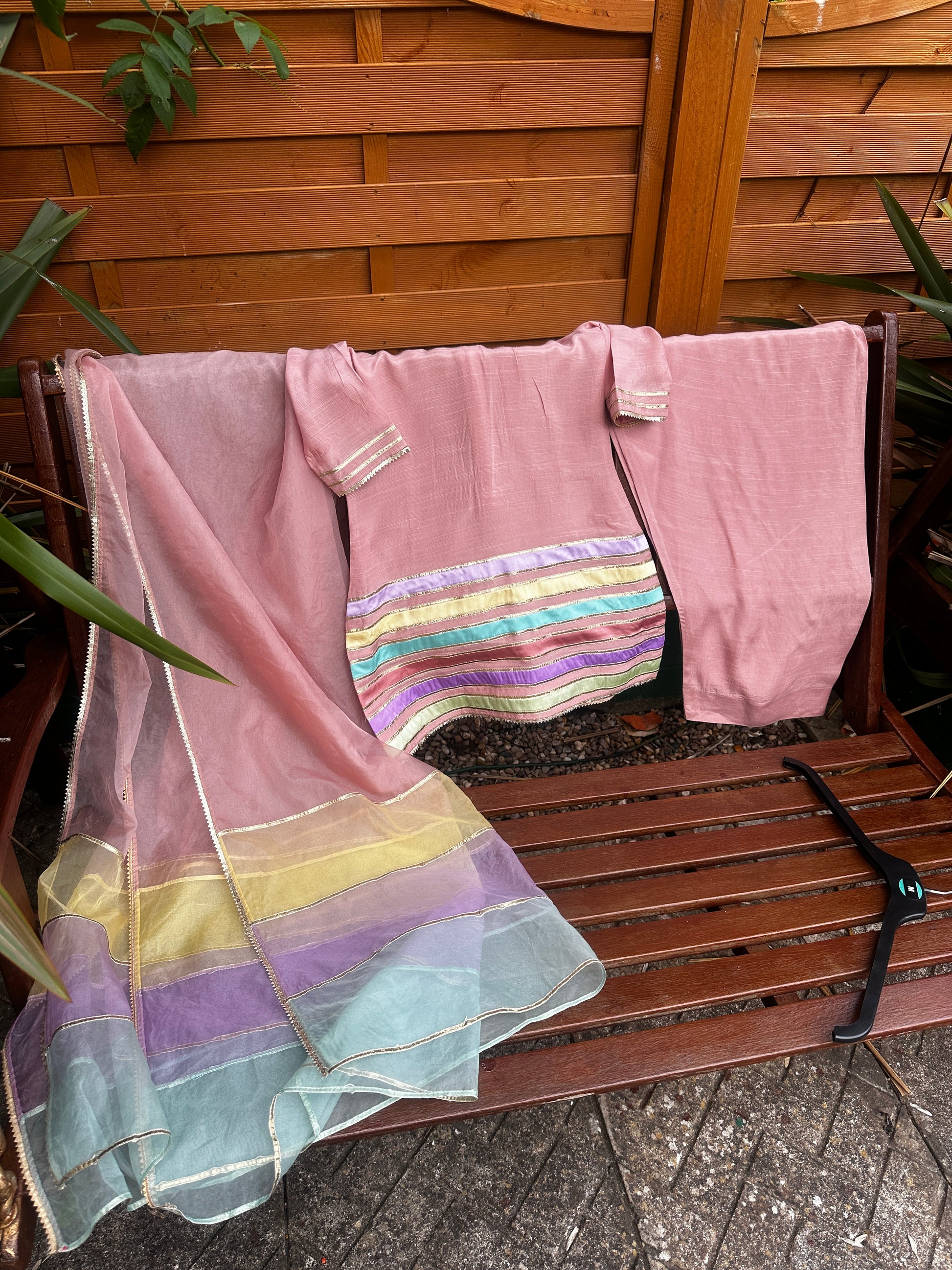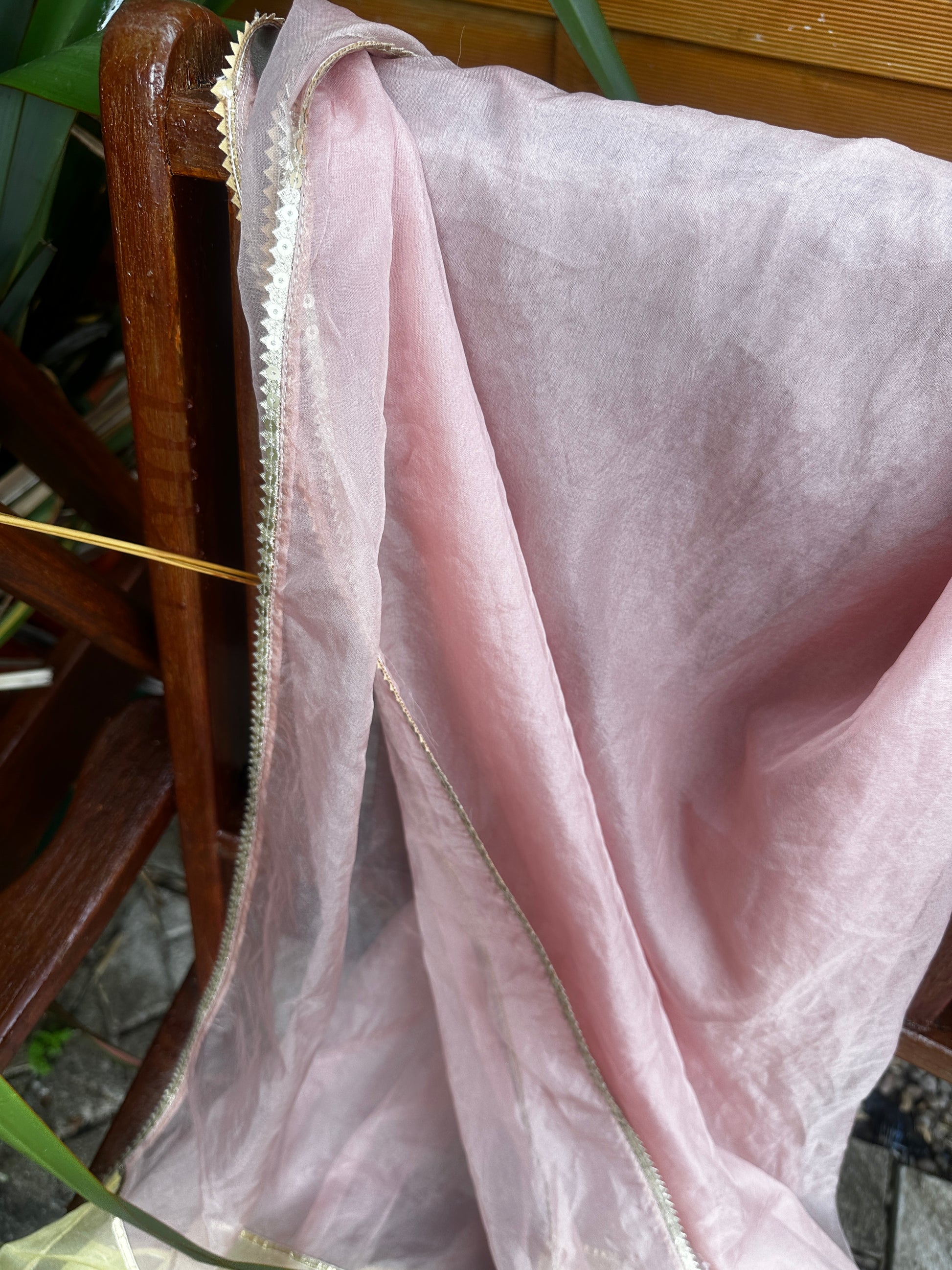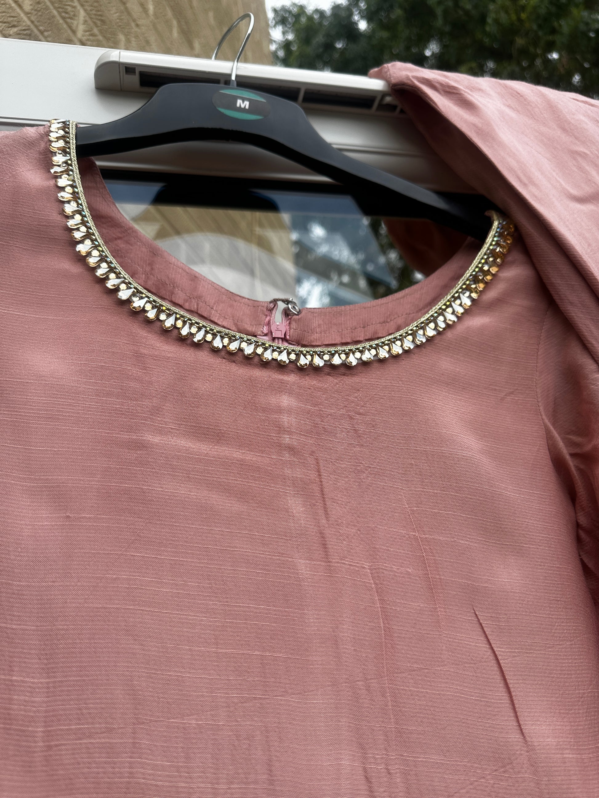Pure 60 gram threads and motifs raw silk. Beautiful tea pink colour. Zehra saleem inspired dress stitched beautifully with lots of detailing. Very trendy. Measurements are; chest 18 inch, shoulder 14, waist with zip 15, length 29, hip, 19, shalwar 39. Sleeves 12 Short shirt with ghera dar shalwar, organza chata Patti dupatta 3 yards. It's very stylish and outstanding piece. Worn only for couple of hours. Only serious buyers contact , no time wasters plz. I take photos and video as proof before dispatching the item to avoid any inconvenience and false claims. Ask any question before buying but no return or fuss afterwards. See my other items too.