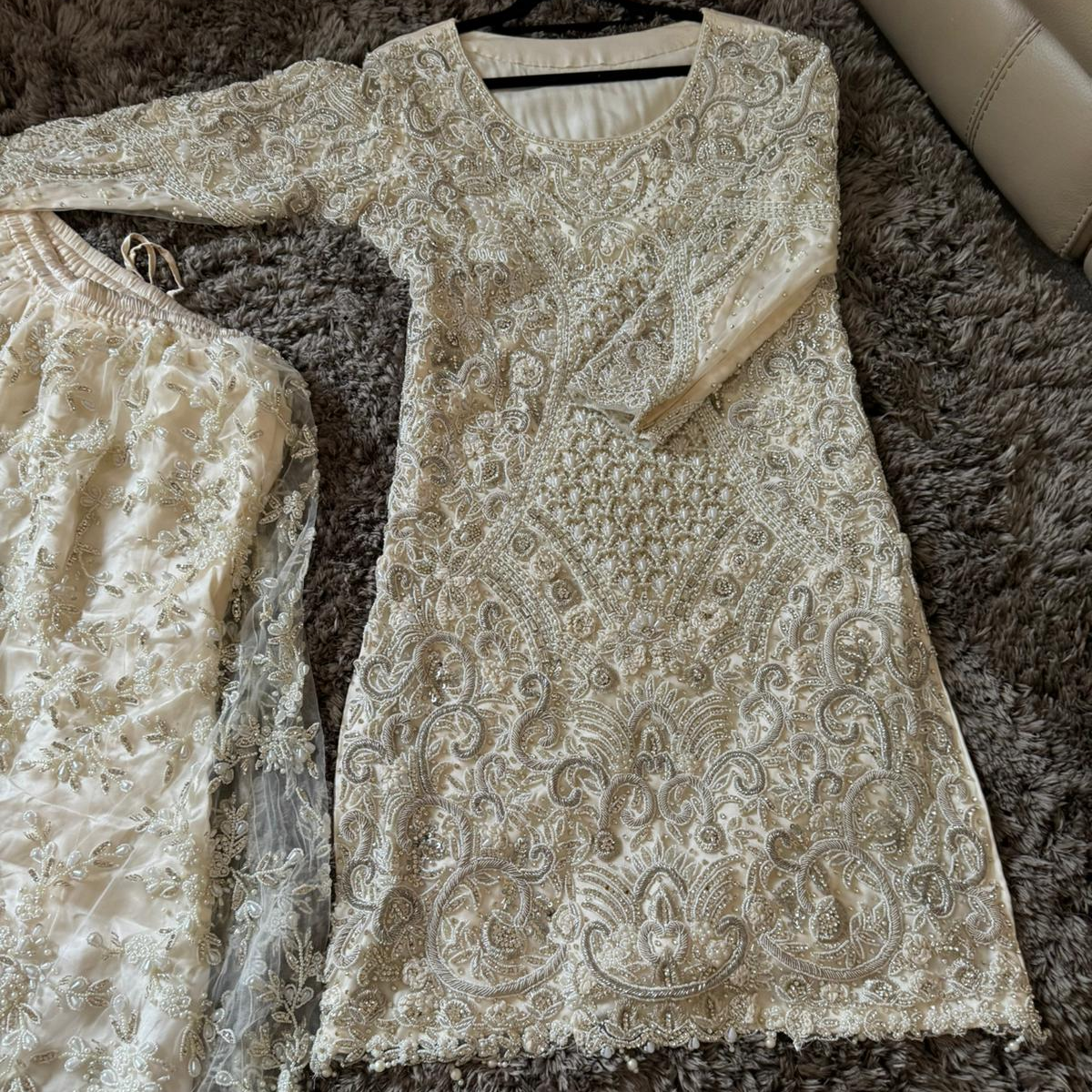 Ivory bridal sharara suit, worn once and in excellent condition. Beautifully hand-embellished with embroidery, pearls and sequin work throughout. Features a fully embellished long kameez, matching sharara trousers and a net dupatta with detailed borders. Elegant ivory tone that photographs beautifully, ideal for nikah, walima, reception or bridal photoshoots. Professionally stitched and very well looked after.