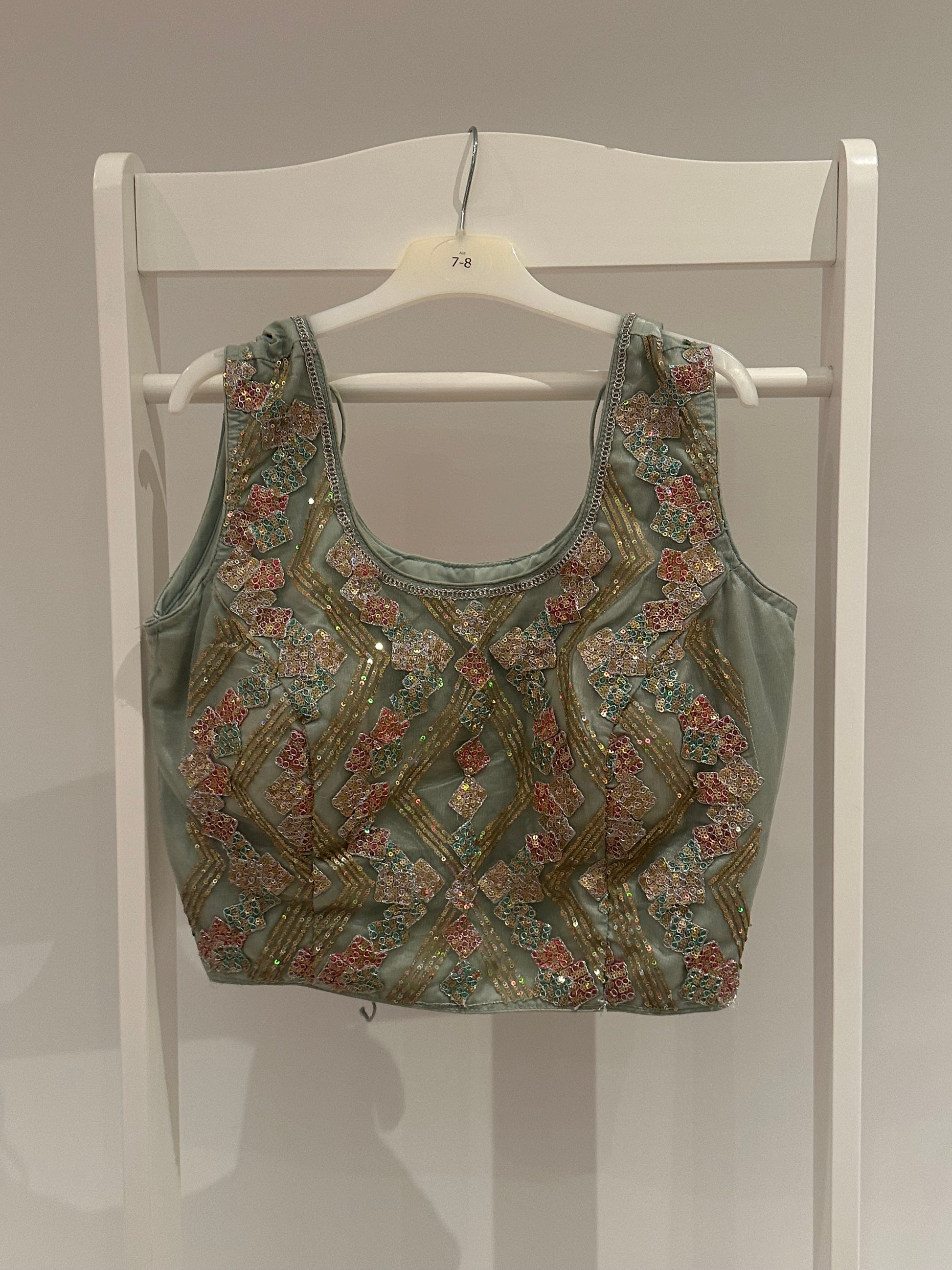 Mint green lehenga with square gold and red embroidery. Comes with organza silk dupatta and two blouses. One sleeveless blouse and one satin long sleeved blouse - made for lehenga but never worn.