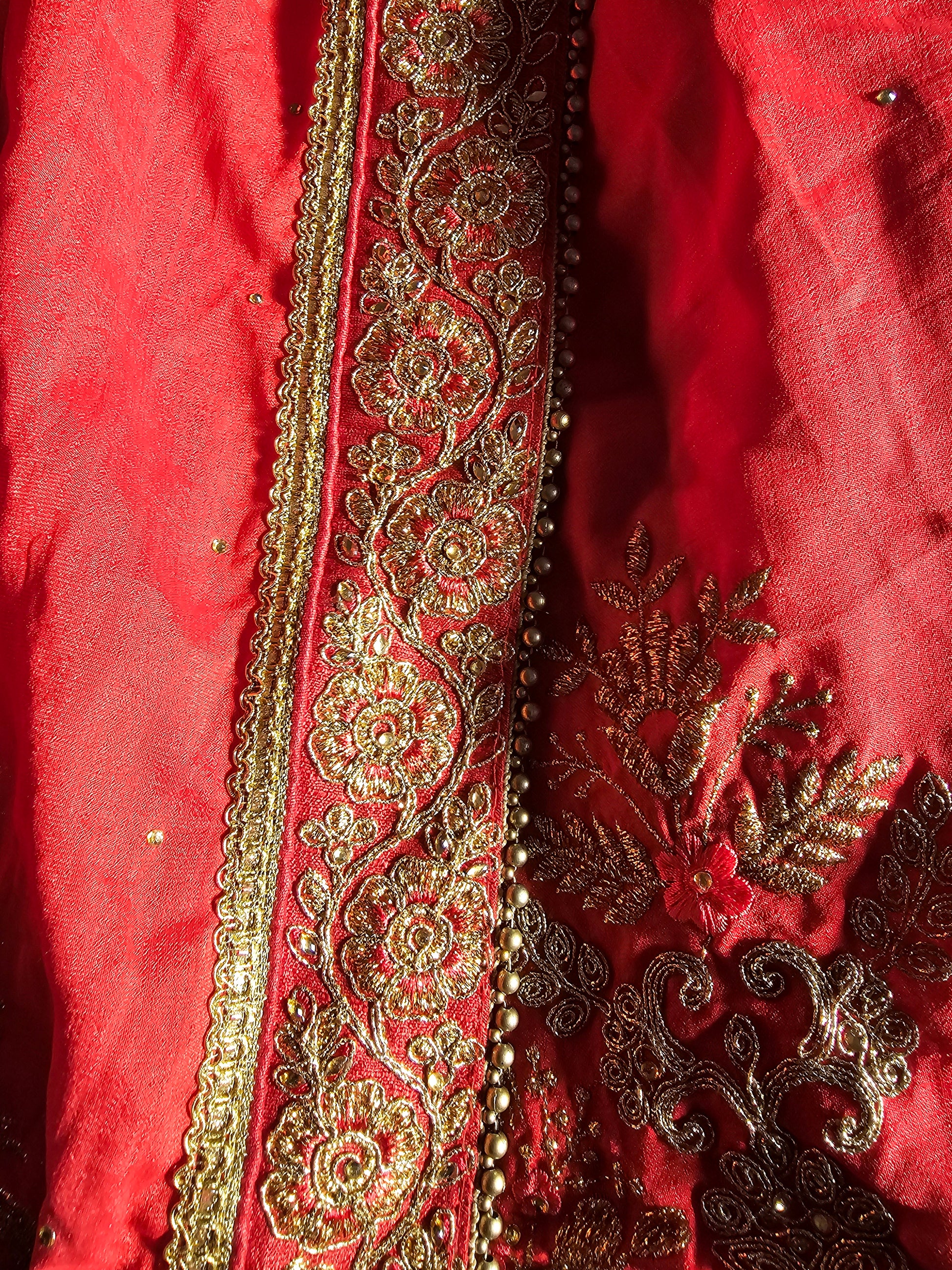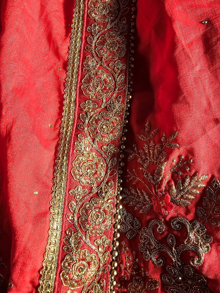 Beautifully embroidered red saree with unstitched contrast burgundy blouse